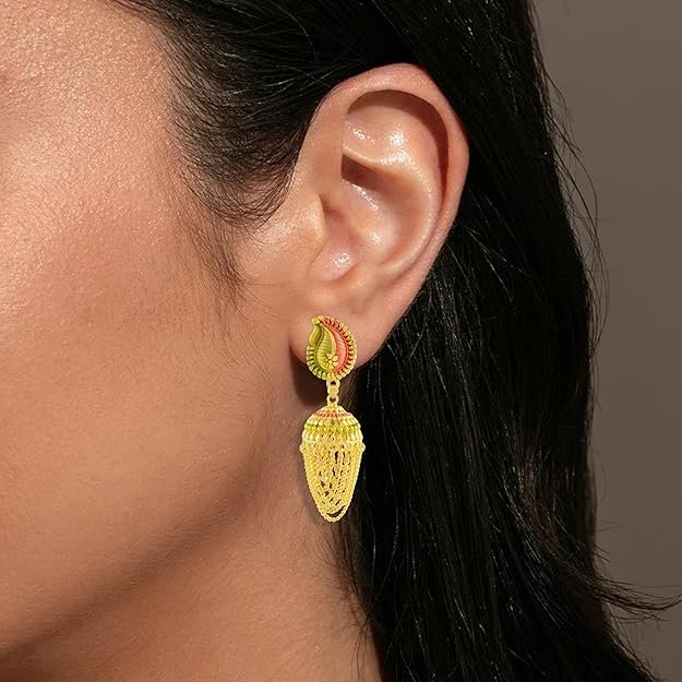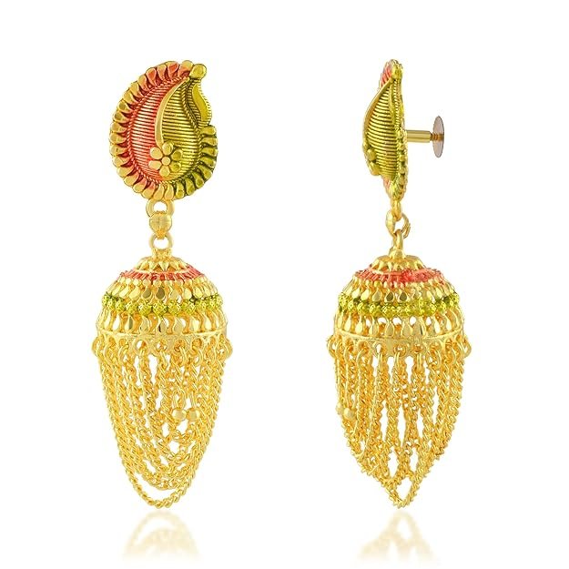 - TRADITIONAL DESIGN: Exquisite handmade Jhumka earrings featuring paisley-shaped tops with meenakari work and elegant graduated chain tassels in 24KT gold-plated finish